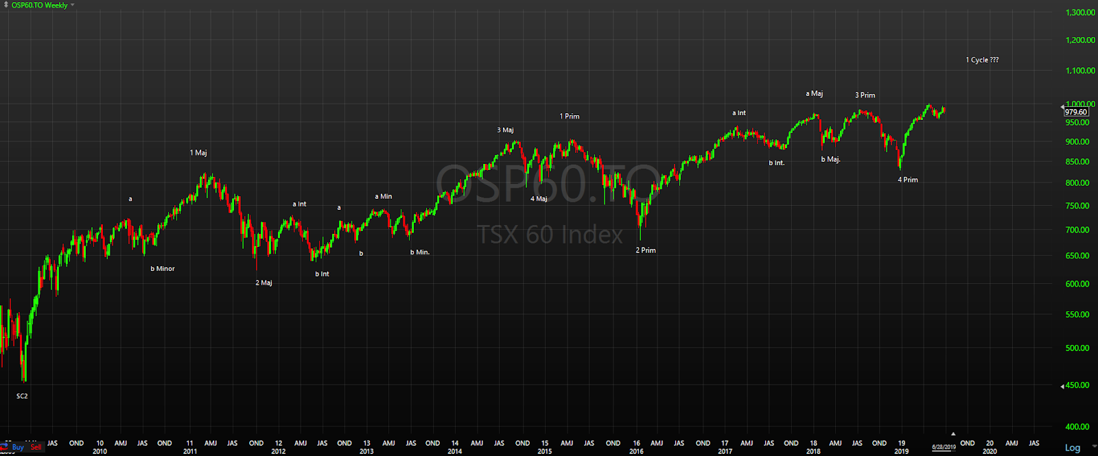 Il semblerait que la première vague de niveau primaire ait pris la forme d’un triangle diagonal. Depuis le creux de la vague 2 de niveau primaire en 2016, nous assistons également à des séries de trois vagues et nous croyons pour le moment que cela pourrait se produire jusqu’à la conclusion de la vague 1 de niveau cycle. Ce compte nous aligne également sur celui du SP500. Le nouveau haut enregistré nous permet de confirmer que la vague 4 de niveau primaire est terminée et que nous sommes en route pour compléter la vague 1 de niveau cycle au cours des prochains mois.