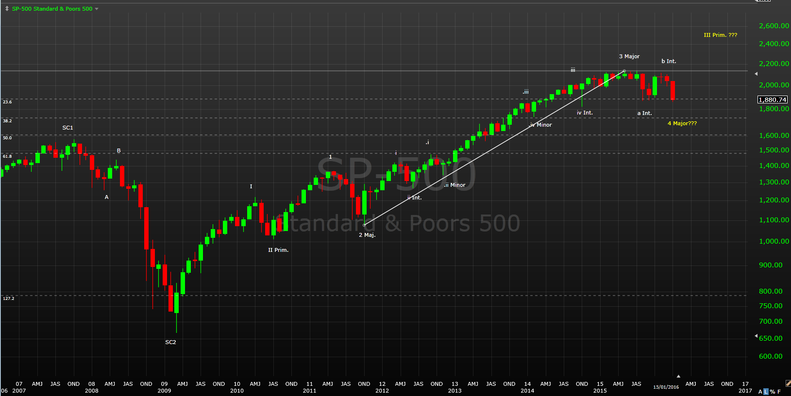 Selon toute vraisemblance, le comportement récent du marché nous porte à croire que la correction entamée au mois d'août n'est pas encore complète. Par conséquent, le compte privilégiée est que nous sommes toujours en train de compléter la vague "4" de niveau majeur. La vague "A" de niveau intermédiaire a été complétée en août 2015 alors que la vague "B" du même niveau a été confirmée en novembre 2015. Nous sommes actuellement en train de compléter la vague "C" de niveau intermédiaire qui, à terme, complètera la vague "4" de niveau majeur. Cette vague "C" de niveau intermédiaire, sera constituée de trois vague "A", "B" et "C" de niveau mineur. La vague "A" de niveau mineur a été complétée à la mi-décembre alors que la vague "B" du même niveau l'a été à la fin décembre. Nous sommes présentement en train de compléter la dernière vague "C" qui a minimalement testé le creux du mois d'août comme nous nous y attendions. Le degré de profondeur de cette vague reste encore à être déterminé mais nous devrions être tout près de la fin.