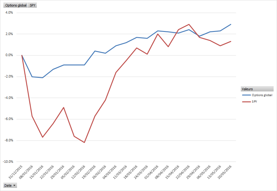 Cette semaine le portefeuille global d'options a terminé en hausse de 0,6% (+2,9% depuis le début 2016) contre un gain de 0,4% pour le portefeuille SPY (+1,3% depuis le début 2016).