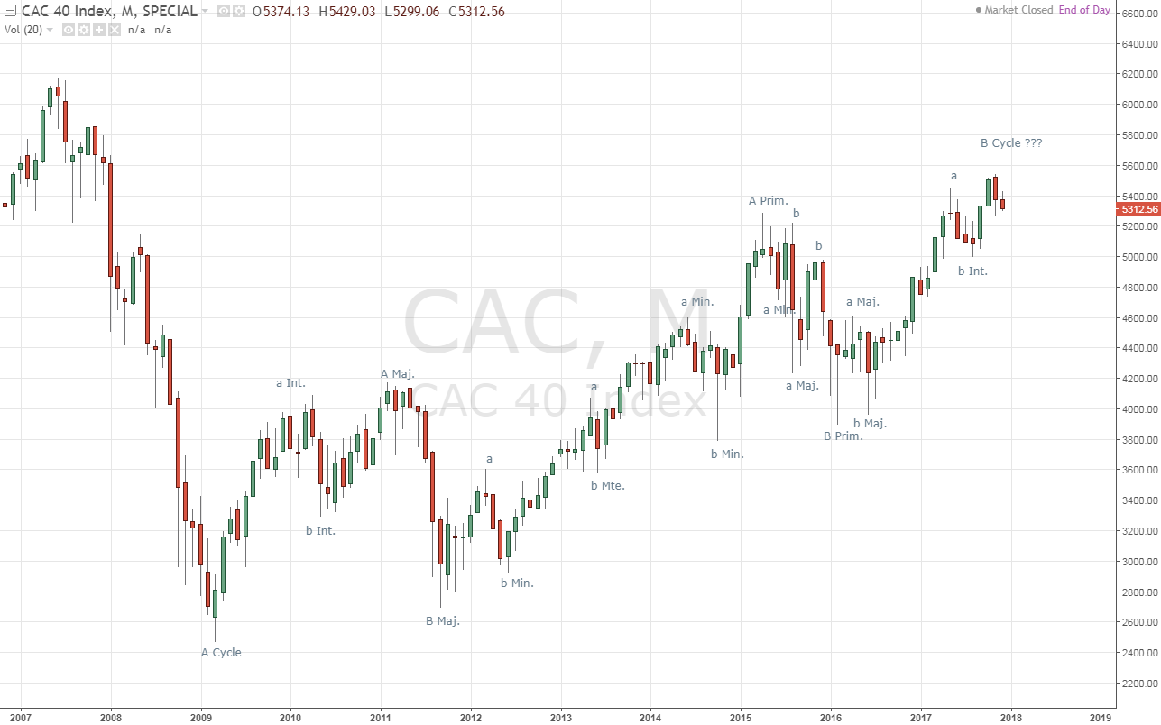 La vague B de niveau primaire a été complétée au creux de 11 531,22 enregistré en janvier 2016. La poussée haussière depuis pourrait être la vague C primaire qui complètera la B de niveau cycle. Les vagues A et B de niveau majeur sont complétées et il ne manque plus que la vague C le soit pour que la vague B de niveau cycle le soit également.